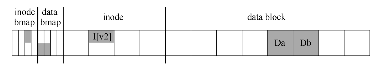 - 写入了位图(B[v2])和数据块(Db),但没有写入 inode(I[v2])。在这种情况下,inode 和数据位图之间再次存在不一致。但是,即使写入块并且位图指示其使用,也不知道它属于哪个文件,因为没有 inode 指向该块。