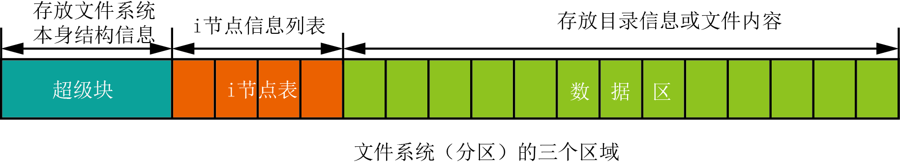 一部分成为数据区,用来存放文件真正的内容。另一部分成为 i-node 表,用来存放文件属性。第三部分成为超级块(superblock),用来存放文件系统自身的信息。文件系统由这 3 部分组合而成,其中任一部分都是由很多有序磁盘块组成的。