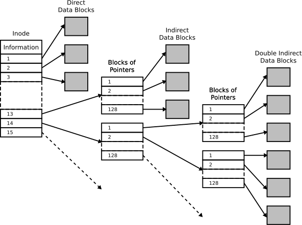 • 文件内容的存储:内核从未被使用的数据块列表中找出足够的数据块,然后将数据从缓冲区复制到对应的数据块中。